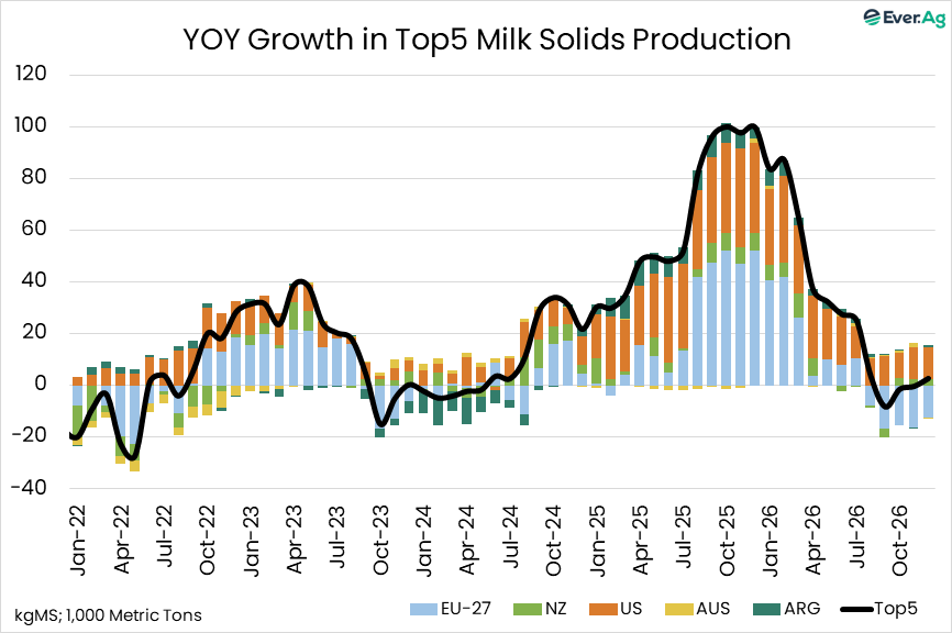 Milk solids output in the EU, US and NZ reached an all-time high in 2025, adding nearly as much supply as in the previous four years combined. Milk growth remains robust in early 2026, but commodity prices are lifting off their recent lows. Fear and short-term demand is driving the market rally, but will prices soften, especially as we head into the Northern Hemisphere’s spring flush?
